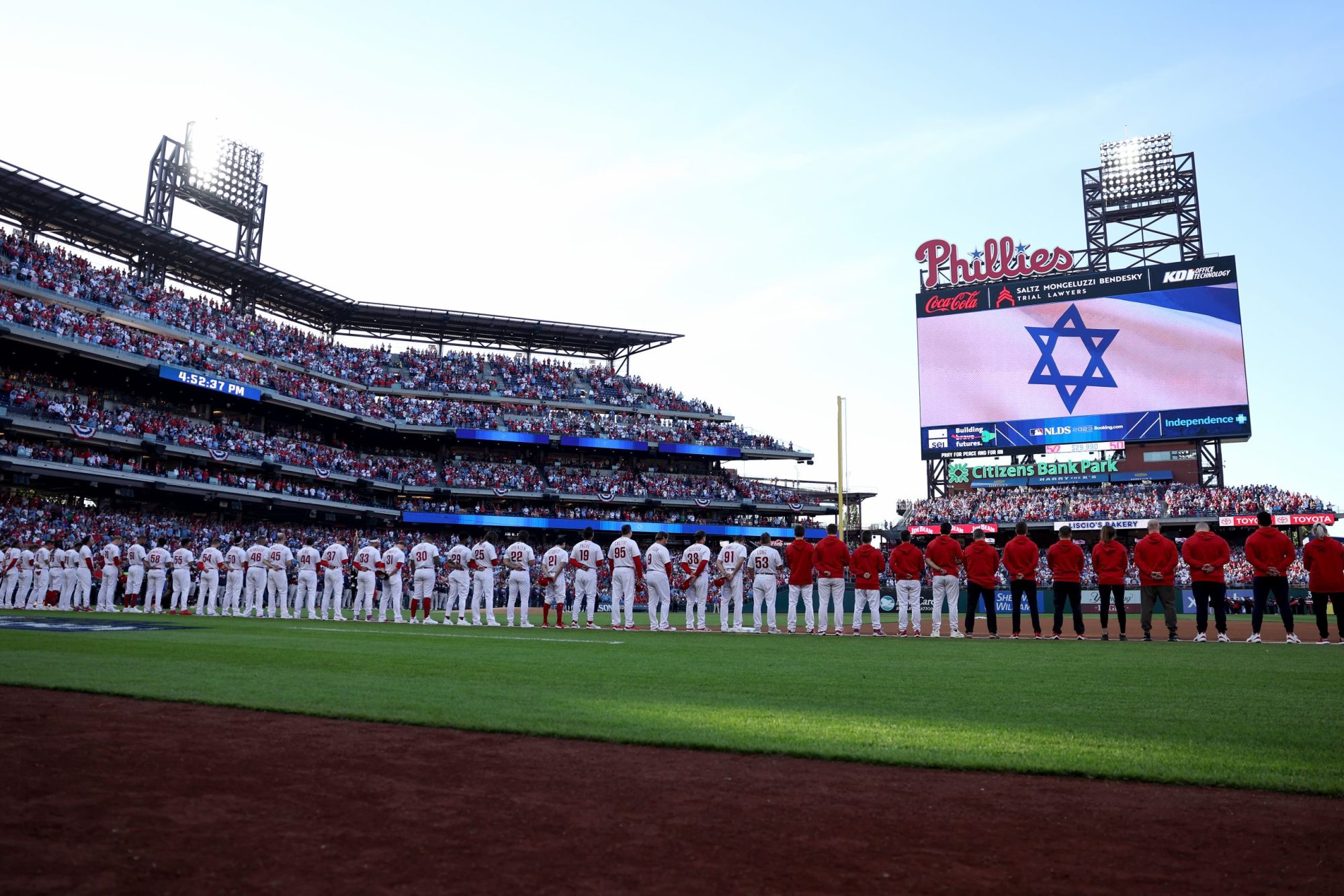 But the NFL actually looks like Desmond Tutu compared to Major League Baseball. The Philadelphia Phillies, before a playoff game, lit up the stadium in powder blue and white while displaying the Israeli flag on the jumbotron.